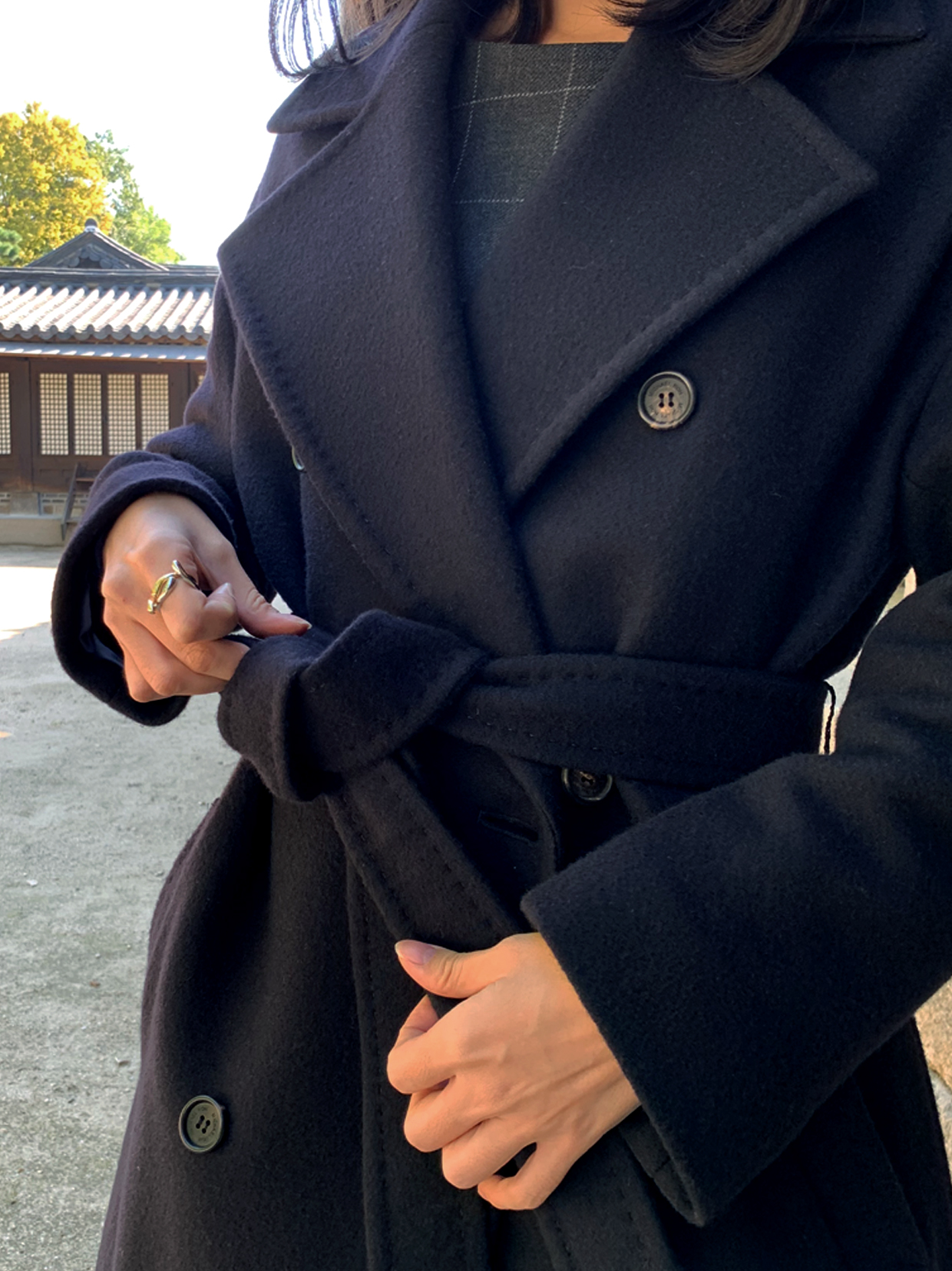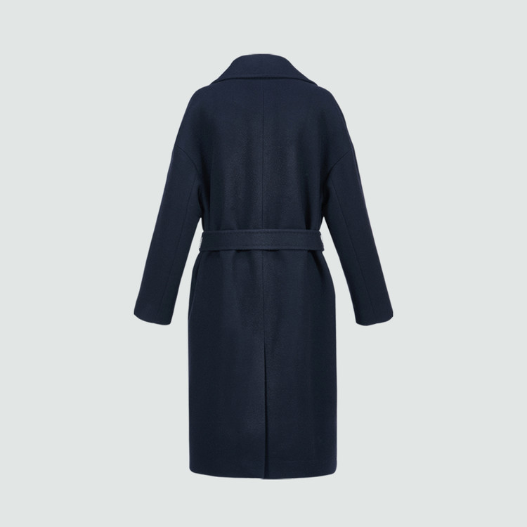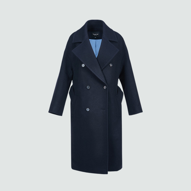있는 네이비 컬러의 더블 브레스티드 벨티드 코트를