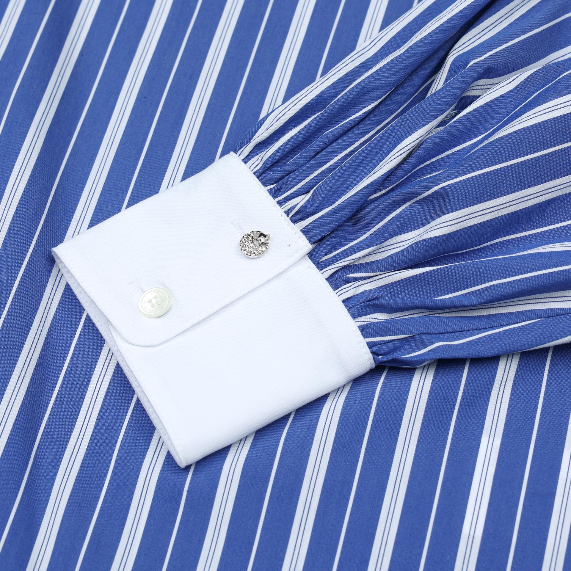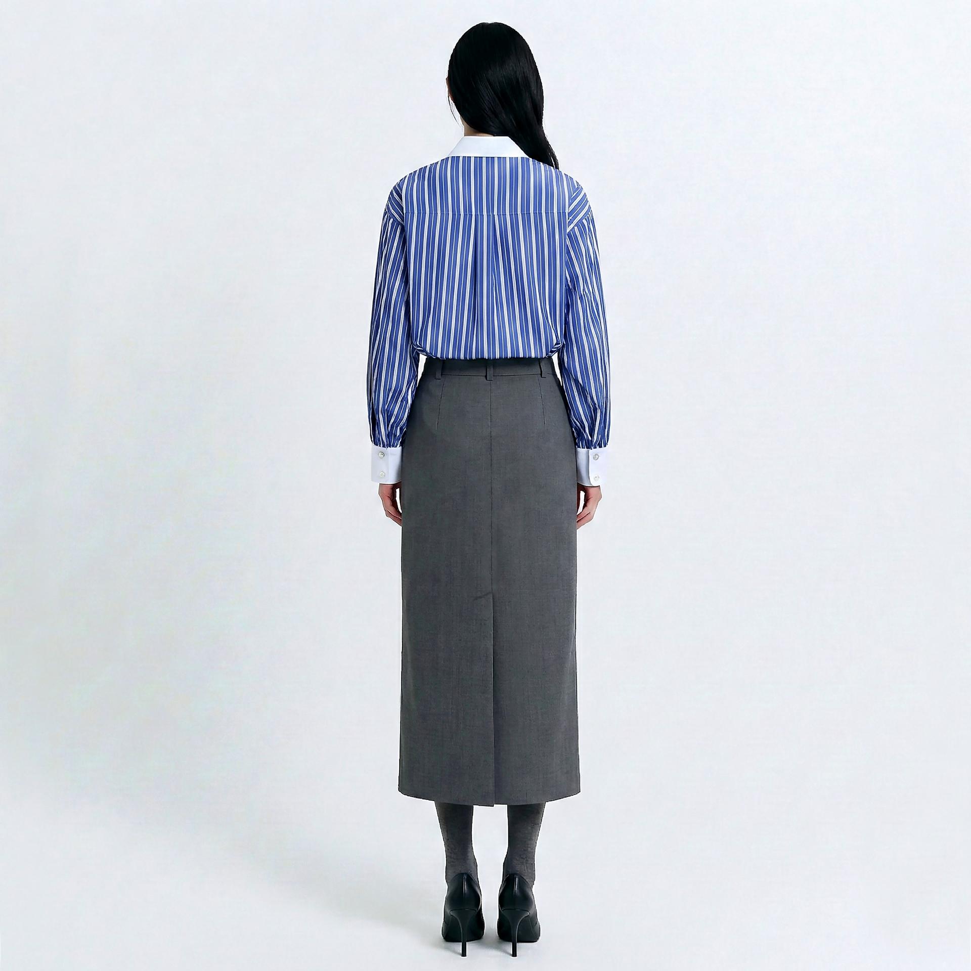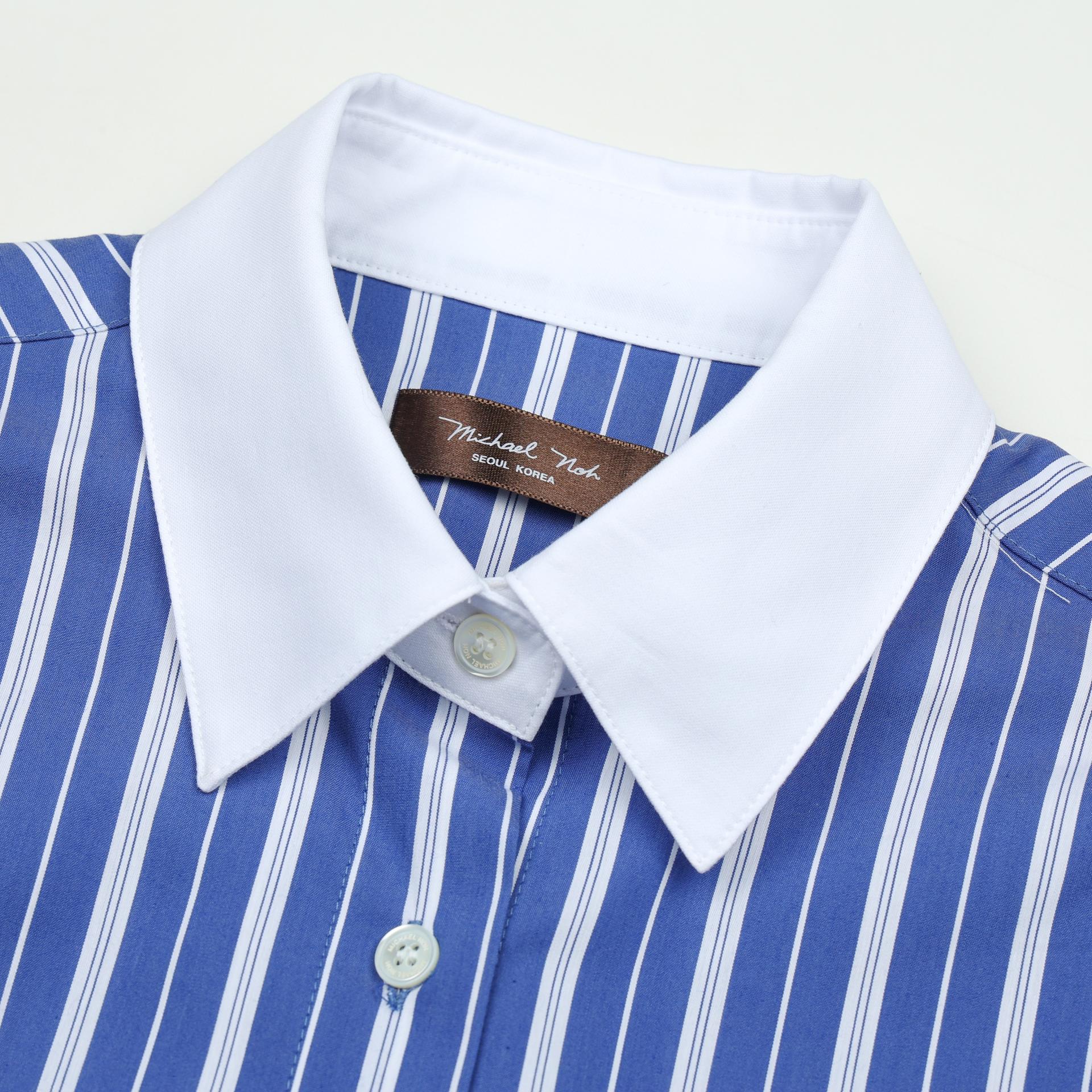 - 카라와 커프스는 화이트 원단으로 배색하여 차분한 블루