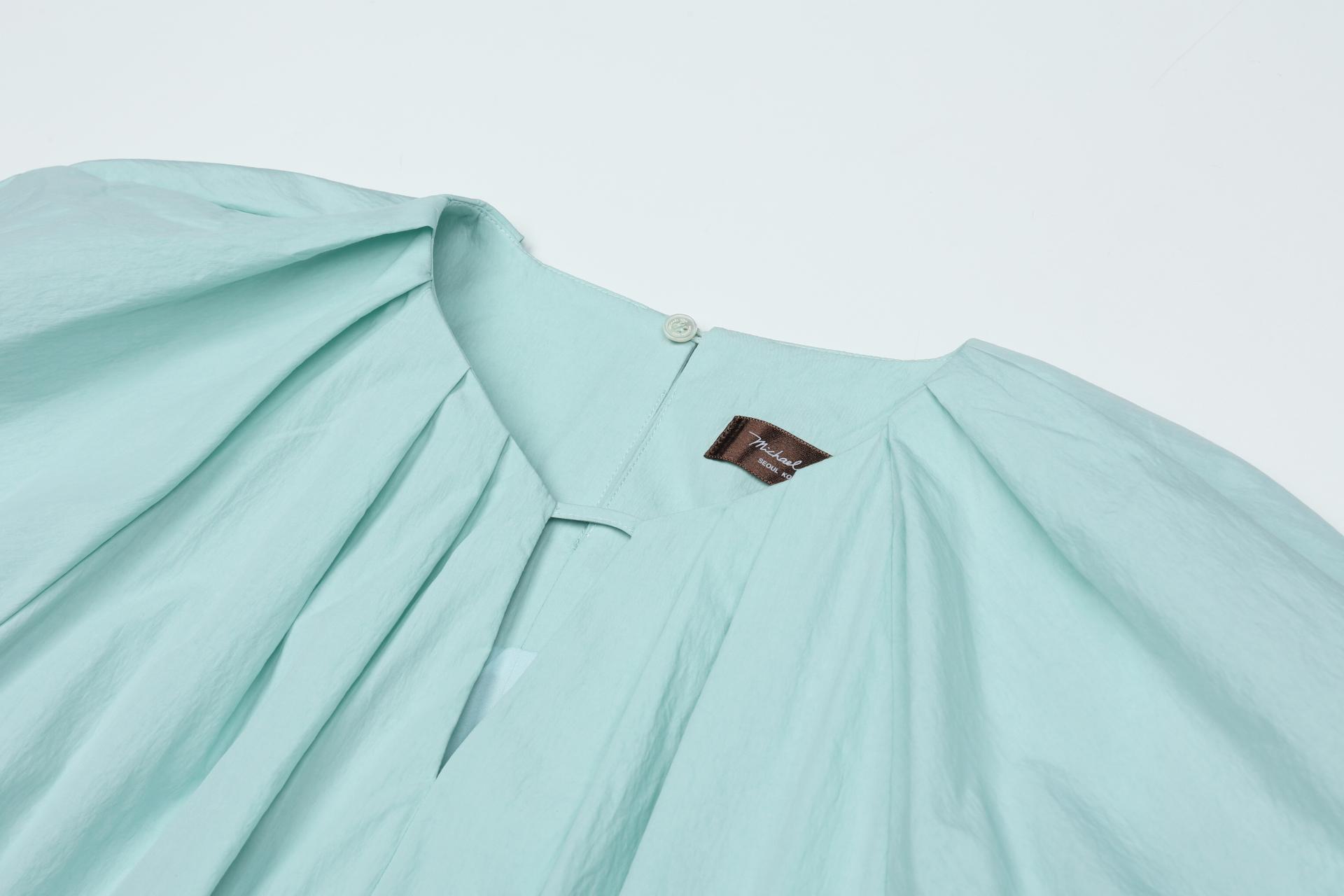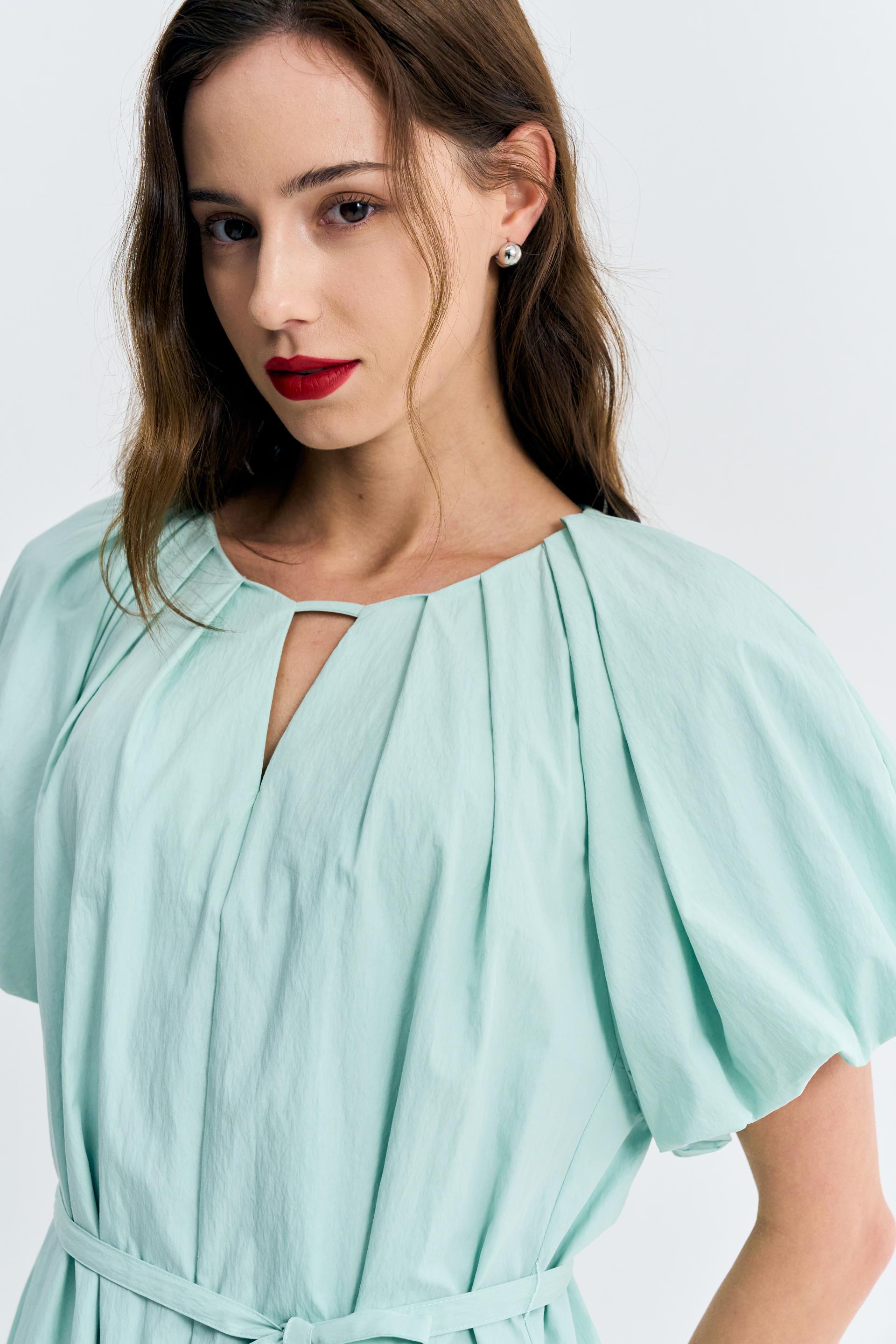 - 퍼프 소매의 볼륨감과 섬세한 핀턱 디테일이 상체를 우아