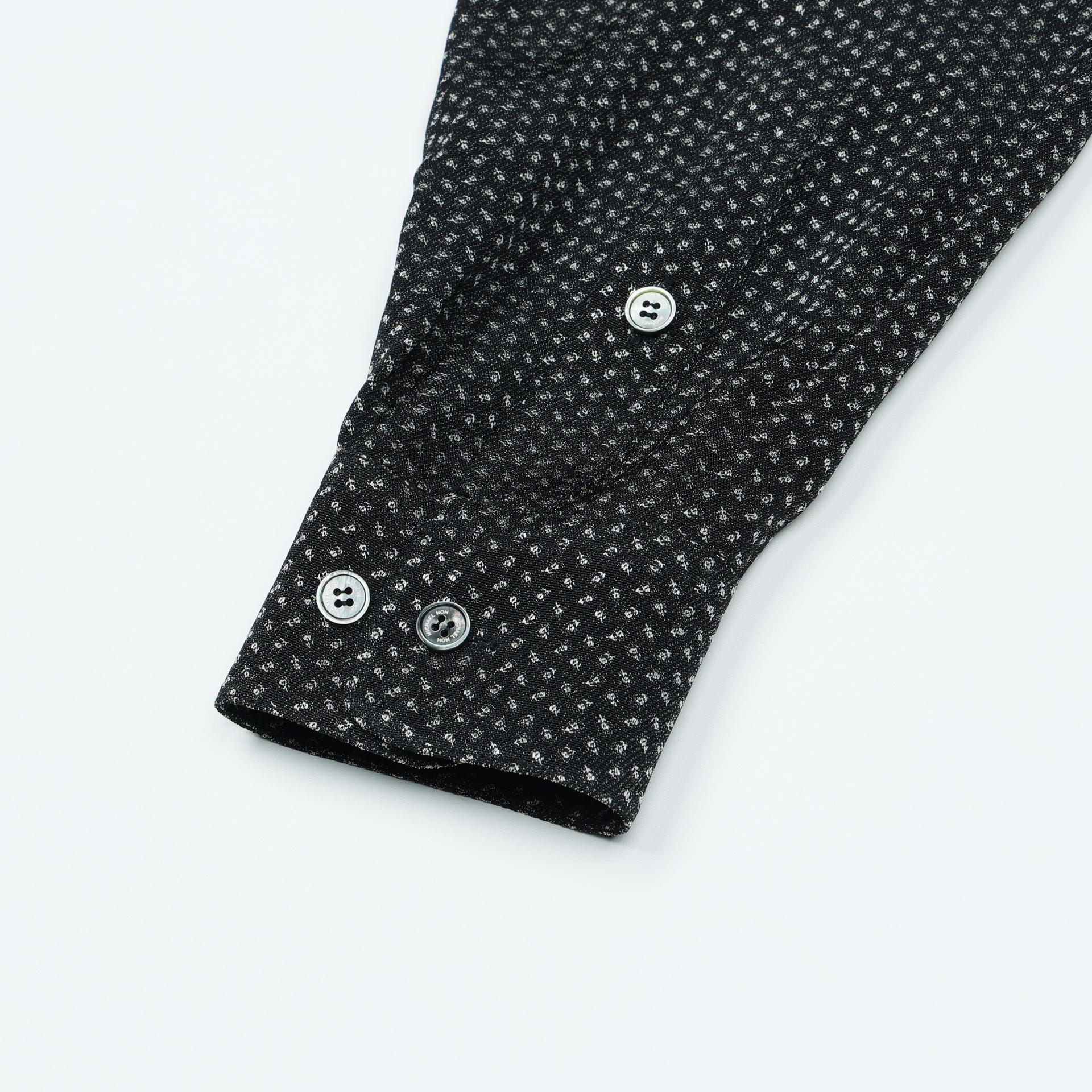 단추의 미세한 빛과 오픈카라의 선이 겹쳐집니다.