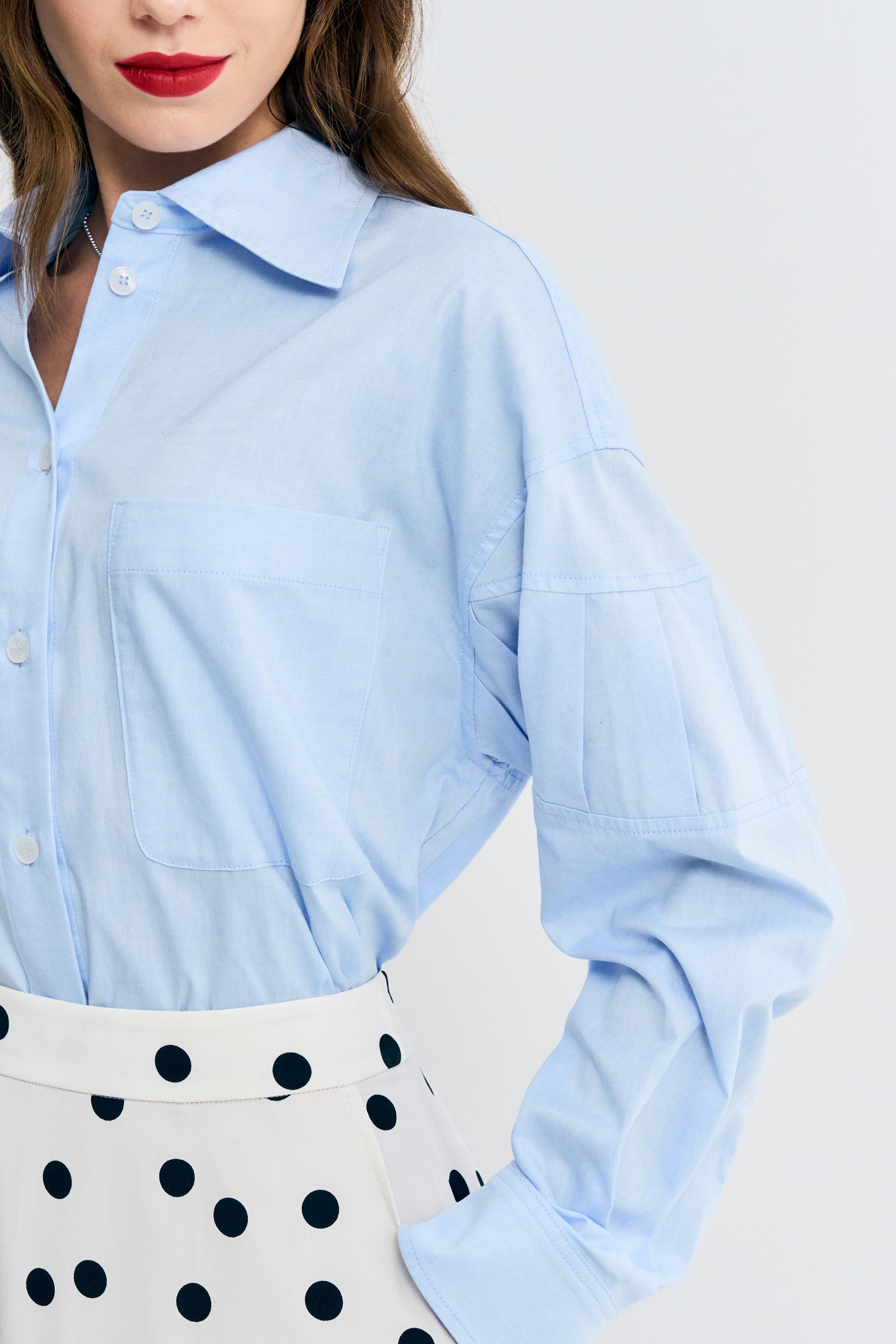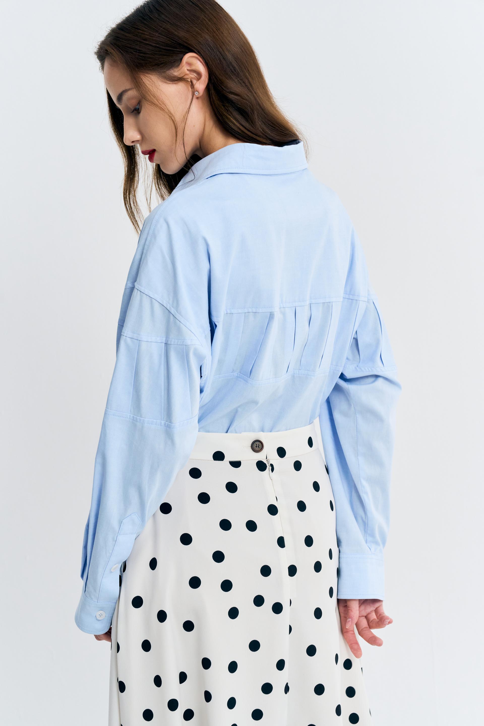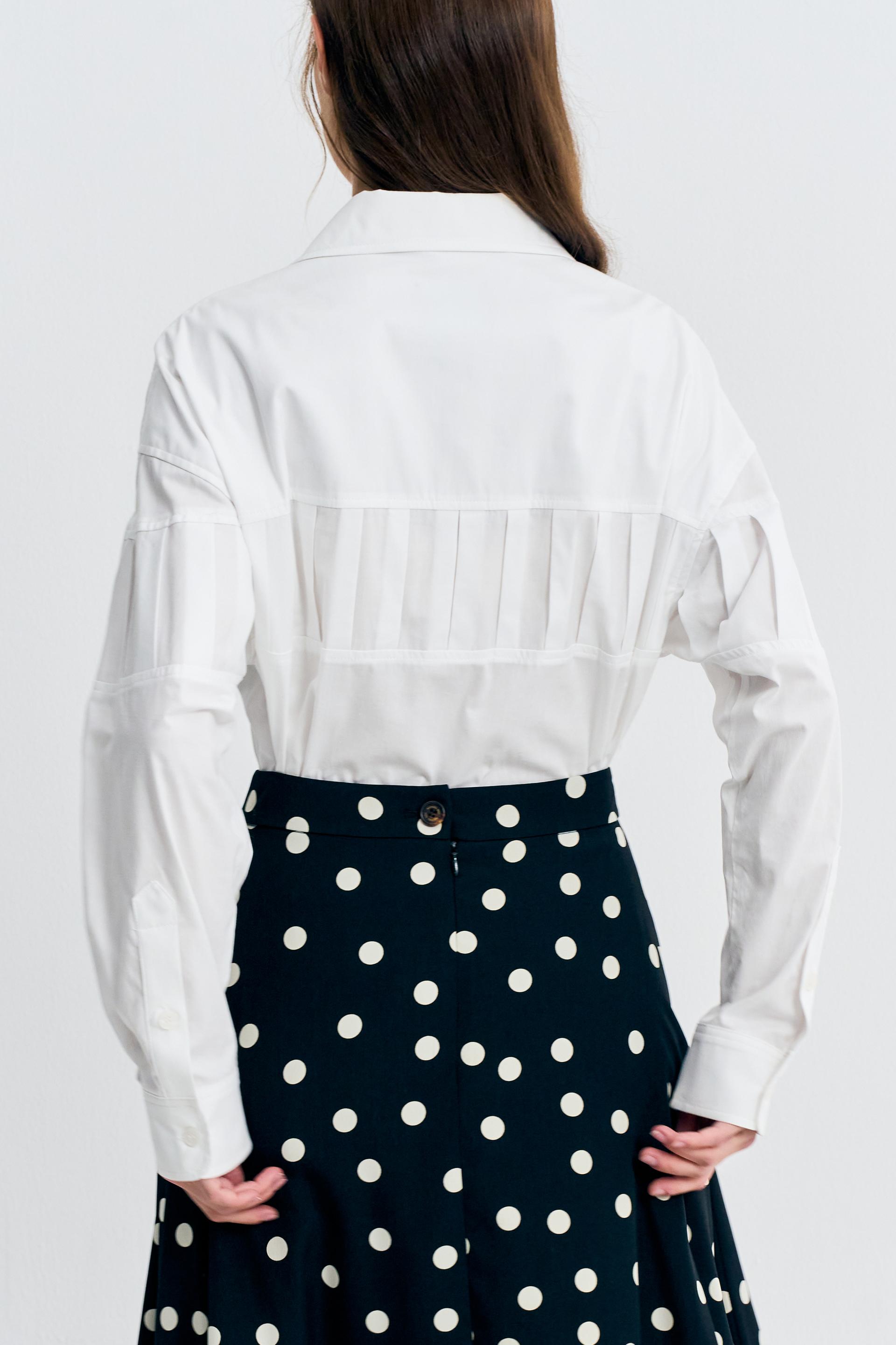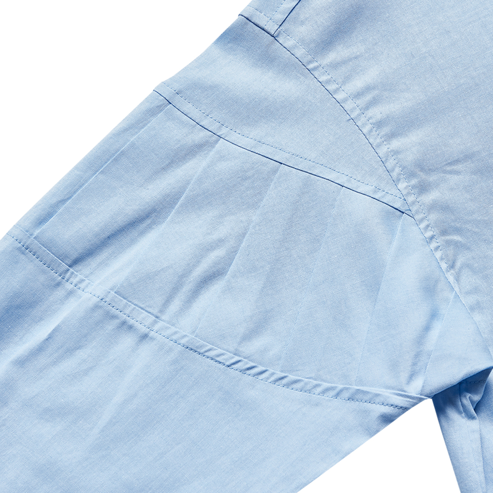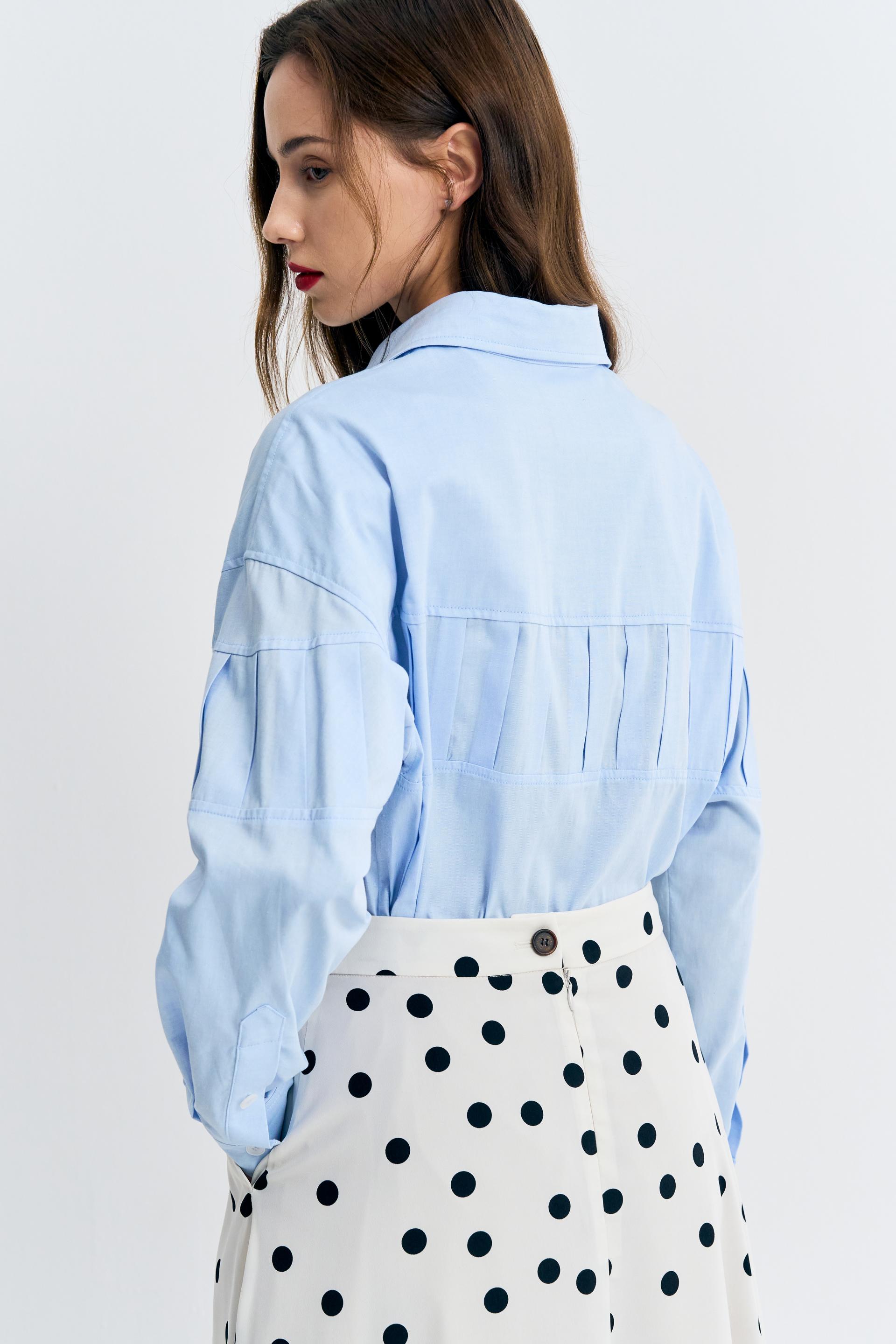 등 부분에 대칭형 플리츠를 제작하여 셔츠에 접목.