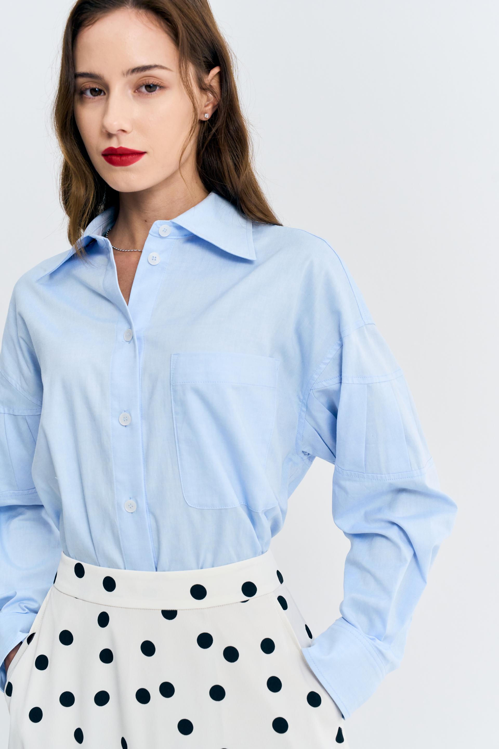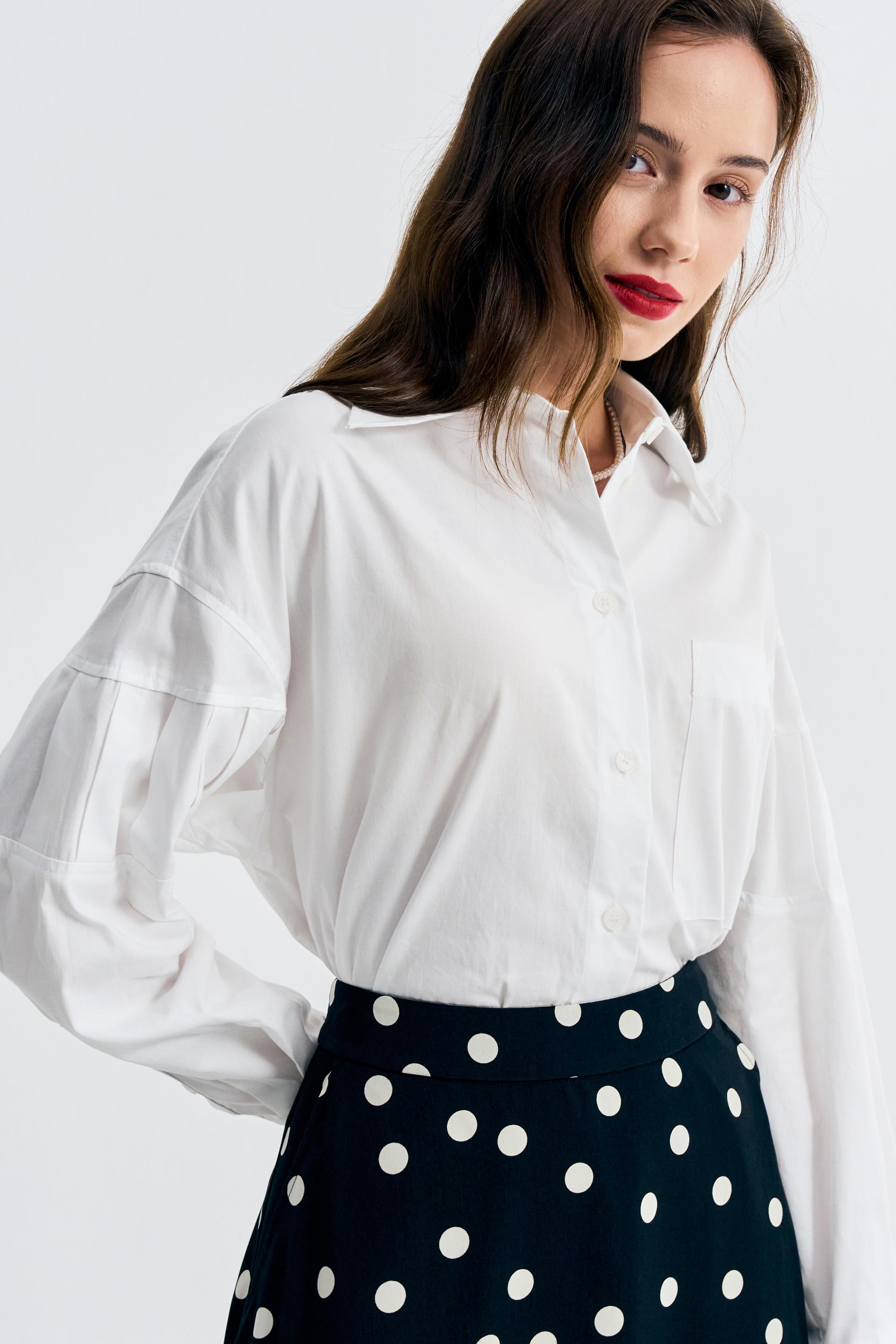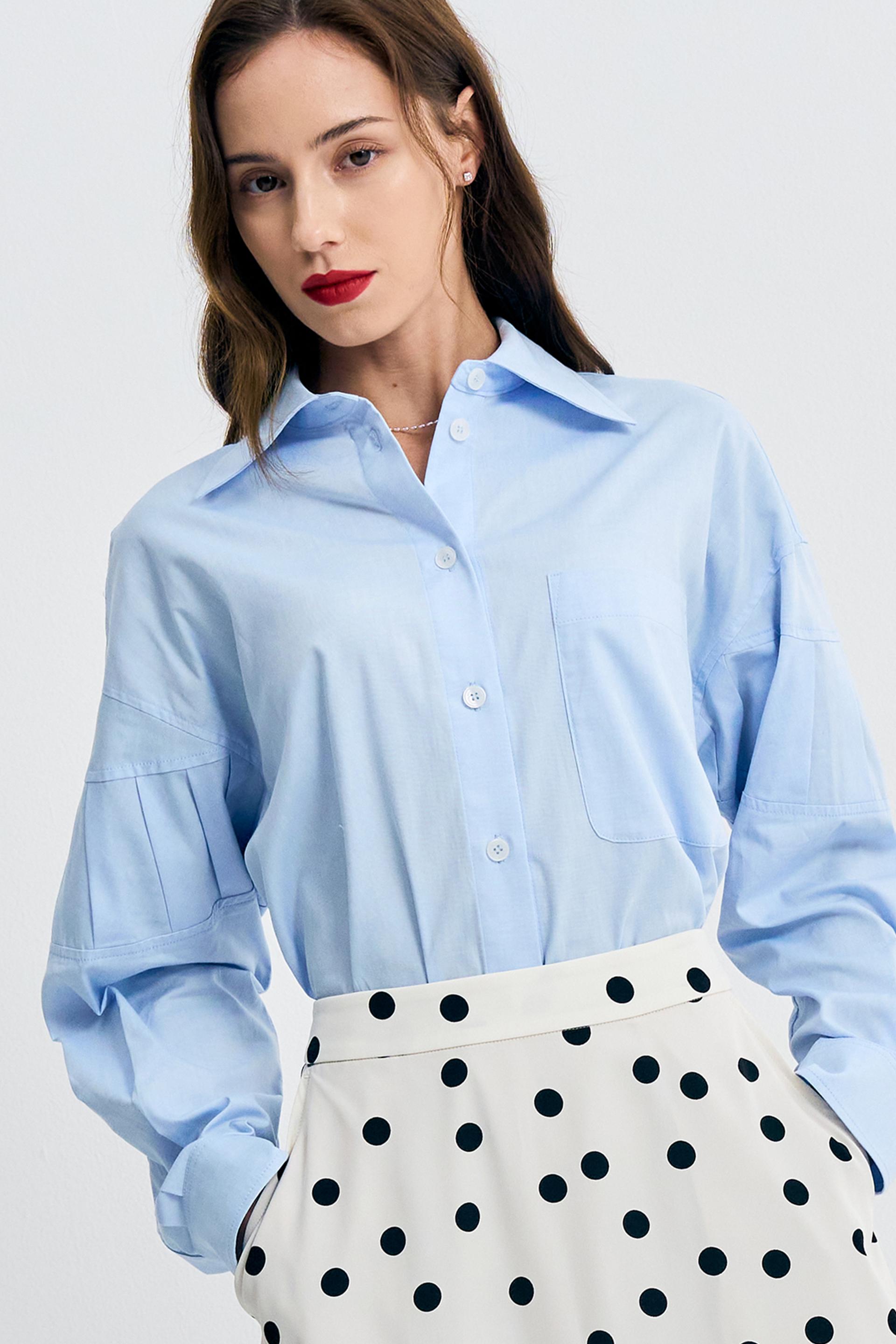 오버사이즈 실루엣의 셔츠로서, 양쪽 팔 둘레와